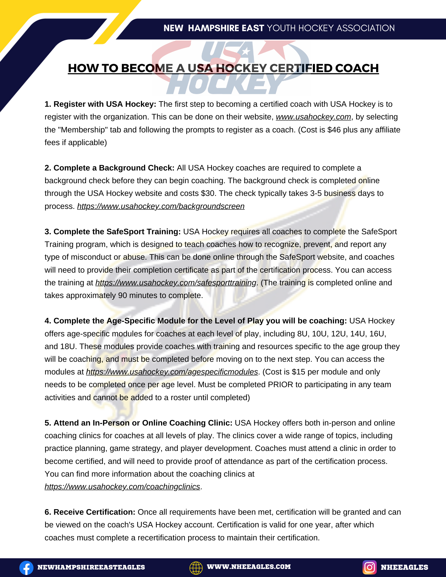 USA Hockey makes an unequaled commitment to coaching education, which means that members of USA Hockey receive unrivaled support and resources for developing young players. The Coaching Education Program requires both certification and registration to be eligible to coach. Registration is done online on a yearly basis. Certification is also required.
